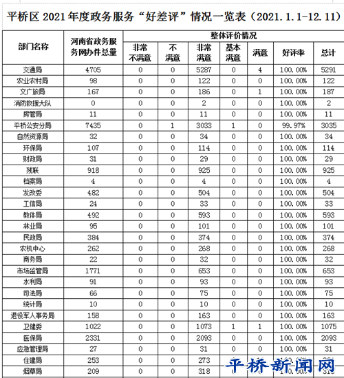 2021年以来,平桥区共收到“好差评”有效评价数102404条,好评率99.99%。其中中差评数10条,中差评回访数10条,整改数10条,整改率100%。目前,政务服务“好差评”可通过河南政务服务网、豫事办APP、支付宝小程序、二维码等线上渠道提交评价,也可通过政务服务大厅评价平板、自助终端、12345热线电话等传统渠道给出评价。现将我区2021年度政务服务“好差评”工作开展情况公示如下: