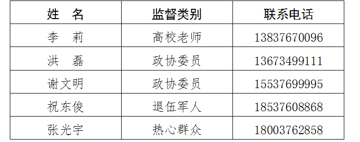 根据国防部征兵办公室《关于建立廉洁征兵“零报告”制度和廉洁征兵监督员制度的通知》要求,按照基层推荐、组织考察、公开公示、集体研究的程序,平桥区人民政府征兵办公室聘请了5名廉洁征兵监督员。现将名单公示如下: